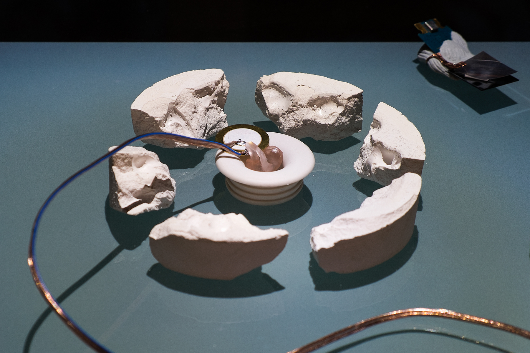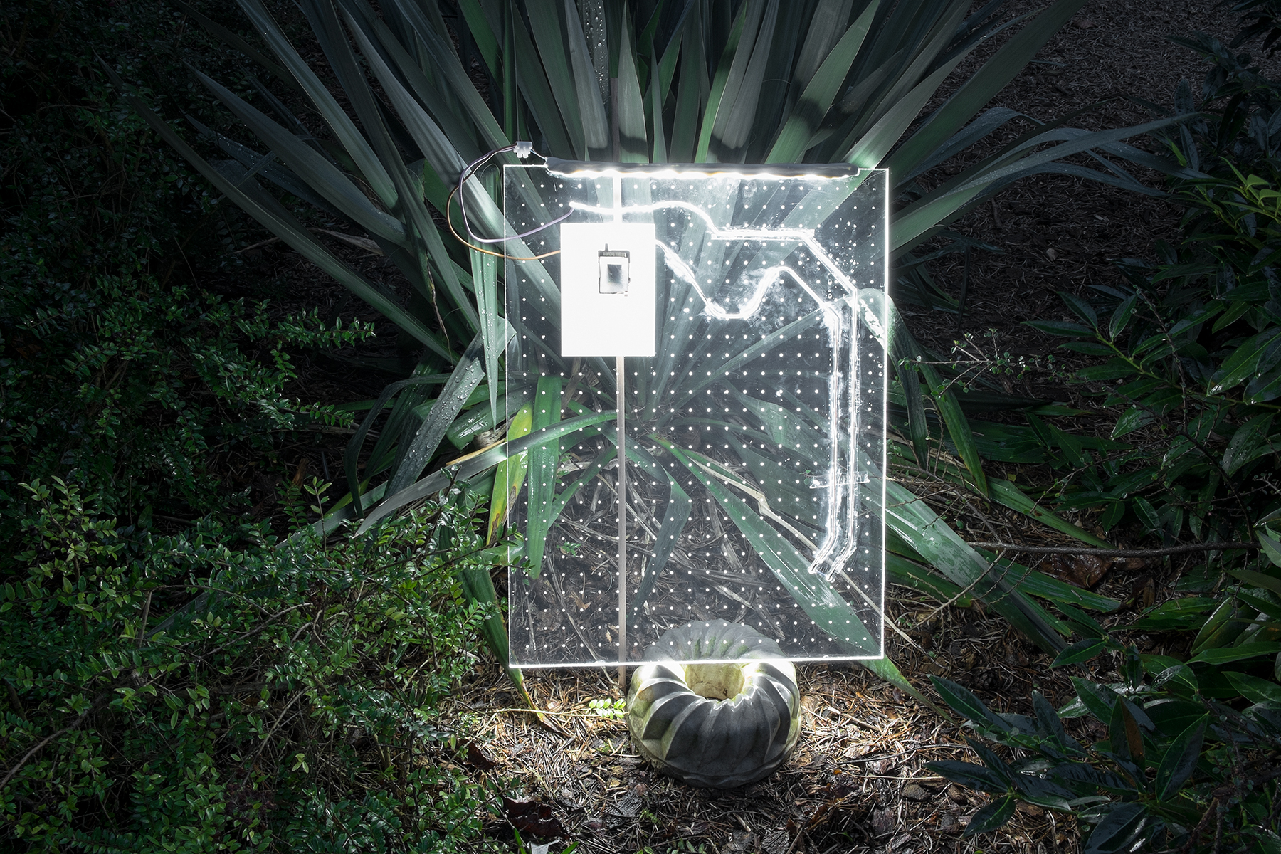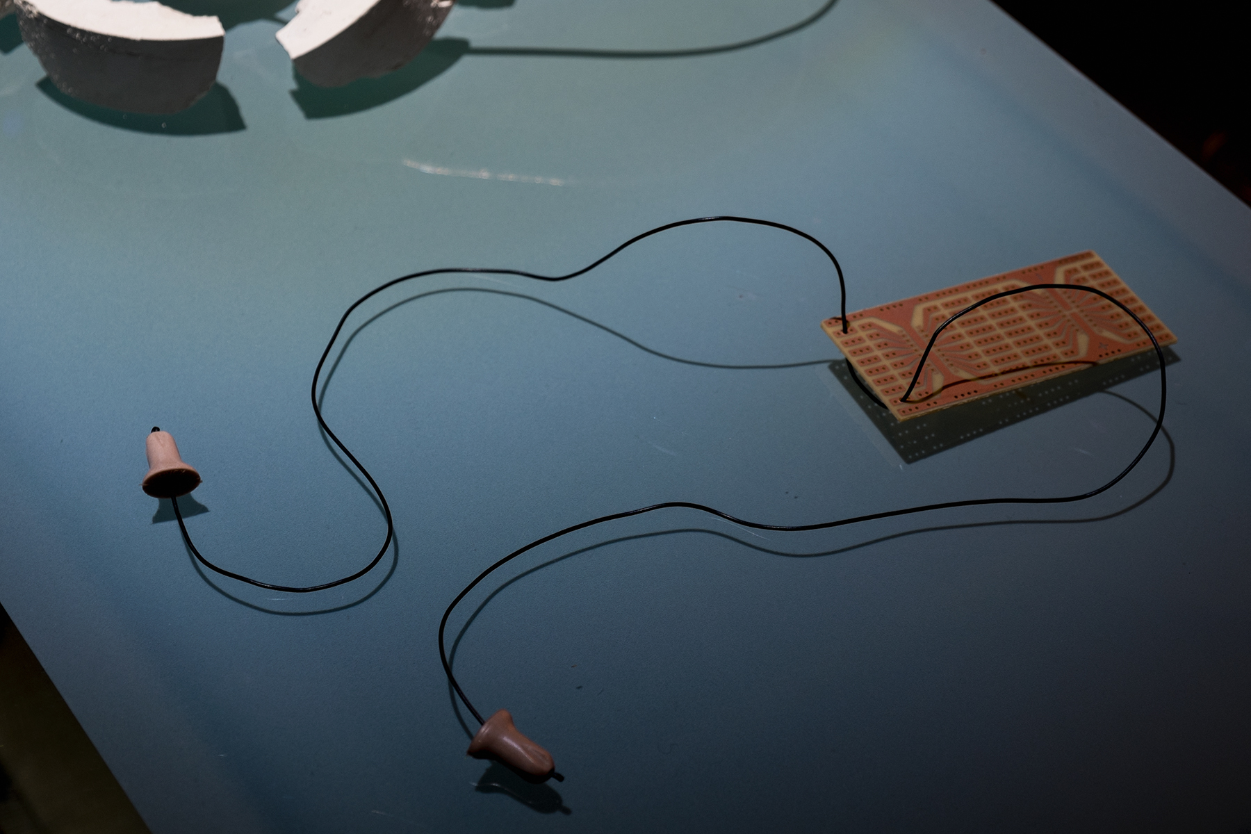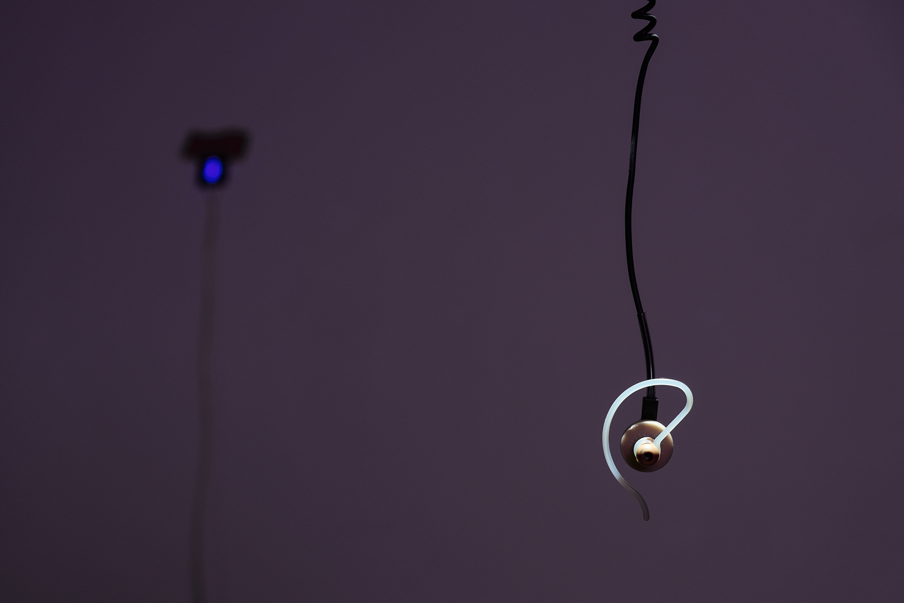 Outside the house, the entrance to the exhibition Performing this glitCh gives you extra lives is flanked with a work by Hunter Longe. It rests on a bundt cake form and consists of a sheet of Plexiglas whose perforation is visible by lighting. The interior of the house is dimly lit by hanging flashlights and a fine violet laser beam. The laser connects the upper room to the lower room, where two leashes are mounted on a wall, the ends of which are connected to a harness. These are called Flexi-leashes because they extend when the dog runs away and retract when it comes back. Roughly centered in the room is an earpiece that hangs from the ceiling. Not far away is the Terminal, a covered aquarium resting on the floor. Spread on top are casts of the inner ear together with assemblages of printed circuit boards and earplugs, as well as a contact microphone. Refined products of fossil fuels are adjacent minerals in various stages of processing—glass, plaster, plastic, circuit boards, silicon—relics and pseudo relics. The aquarium is the center of the total installation. Out of it pours a complex root systems of handmade cables that meander through the rooms. They meet at the Terminal to end in speakers, amplifiers, transformers and power supplies.