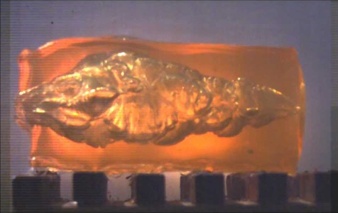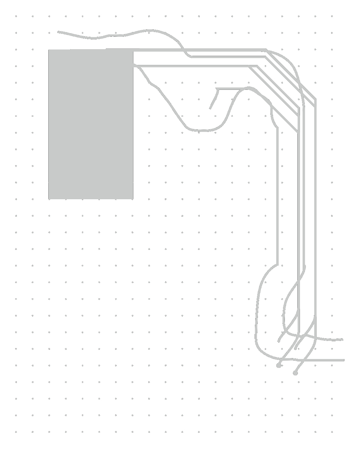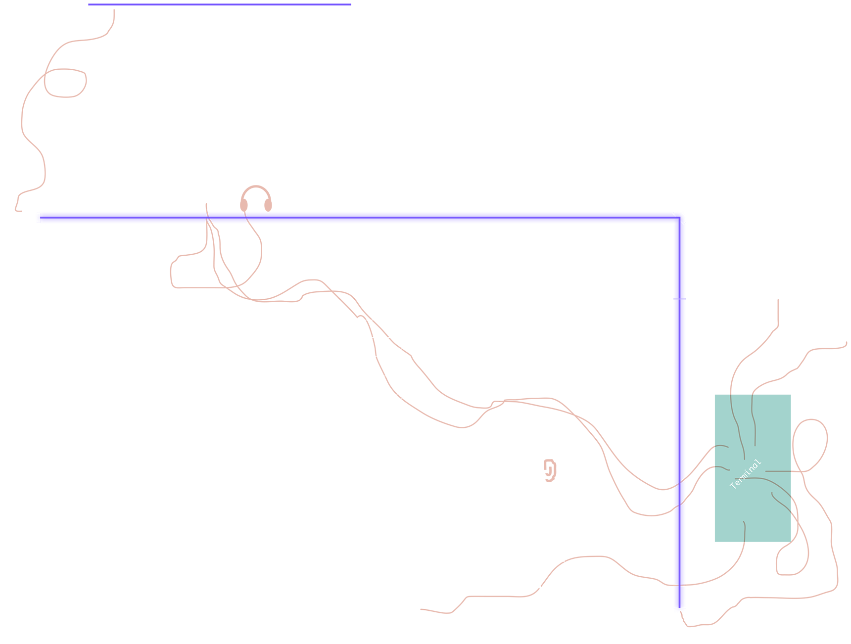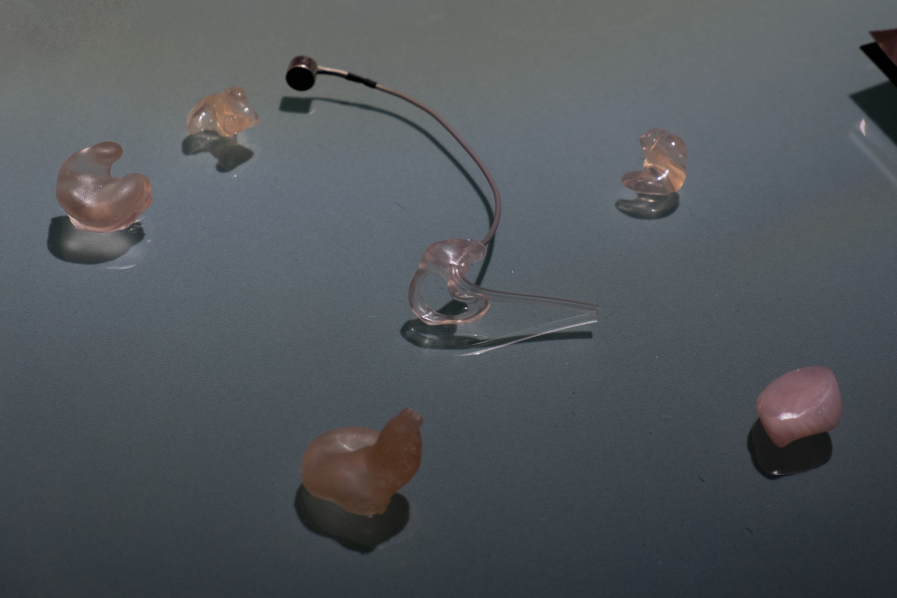 Outside the house, the entrance to the exhibition Performing this glitCh gives you extra lives is flanked with a work by Hunter Longe. It rests on a bundt cake form and consists of a sheet of Plexiglas whose perforation is visible by lighting. The interior of the house is dimly lit by hanging flashlights and a fine violet laser beam. The laser connects the upper room to the lower room, where two leashes are mounted on a wall, the ends of which are connected to a harness. These are called Flexi-leashes because they extend when the dog runs away and retract when it comes back. Roughly centered in the room is an earpiece that hangs from the ceiling. Not far away is the Terminal, a covered aquarium resting on the floor. Spread on top are casts of the inner ear together with assemblages of printed circuit boards and earplugs, as well as a contact microphone. Refined products of fossil fuels are adjacent minerals in various stages of processing—glass, plaster, plastic, circuit boards, silicon—relics and pseudo relics. The aquarium is the center of the total installation. Out of it pours a complex root systems of handmade cables that meander through the rooms. They meet at the Terminal to end in speakers, amplifiers, transformers and power supplies.