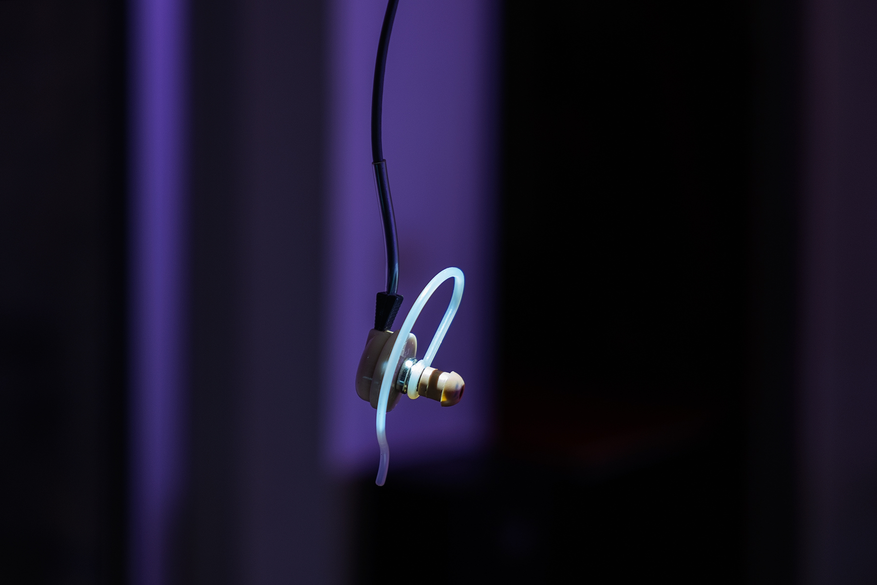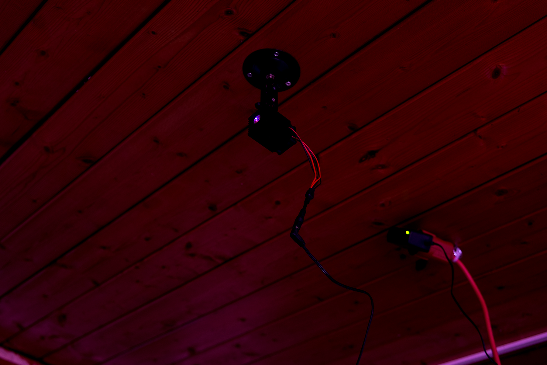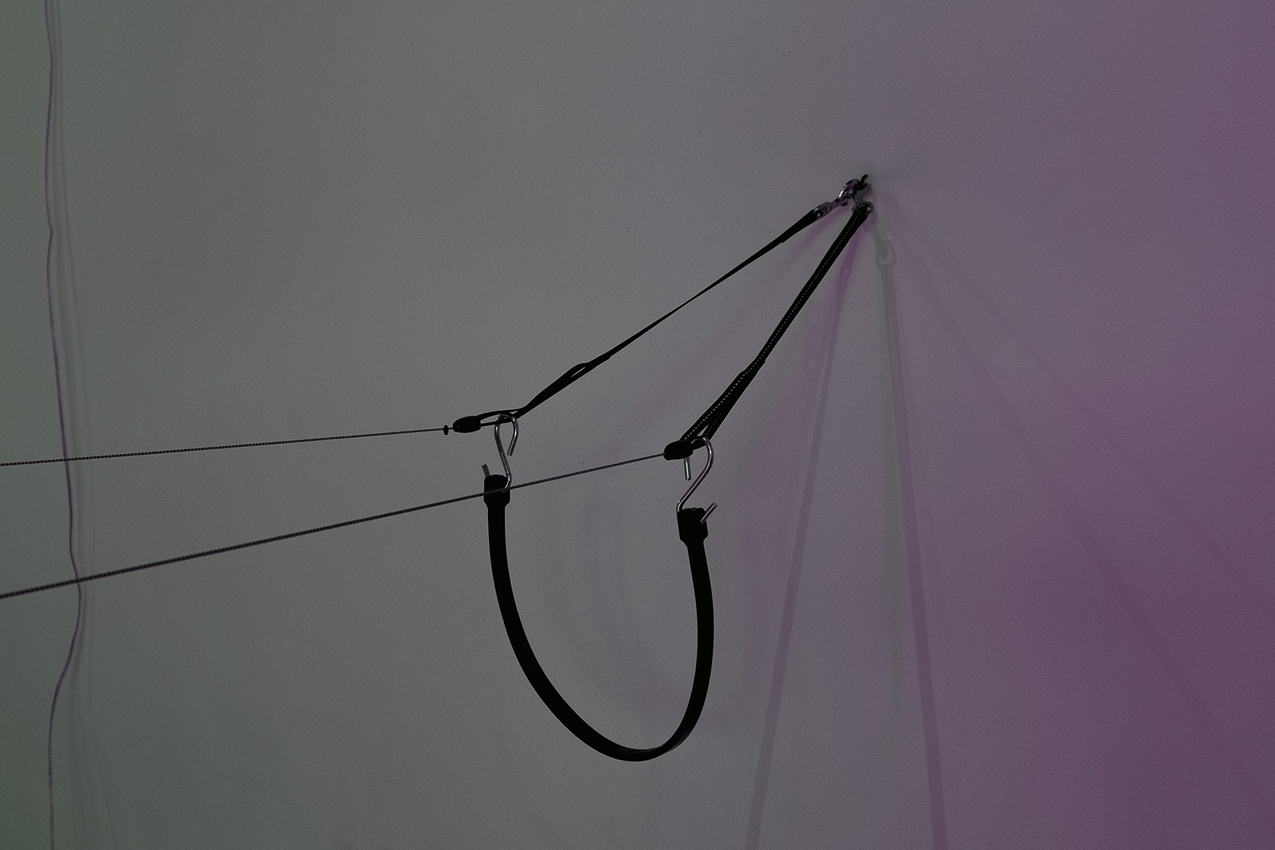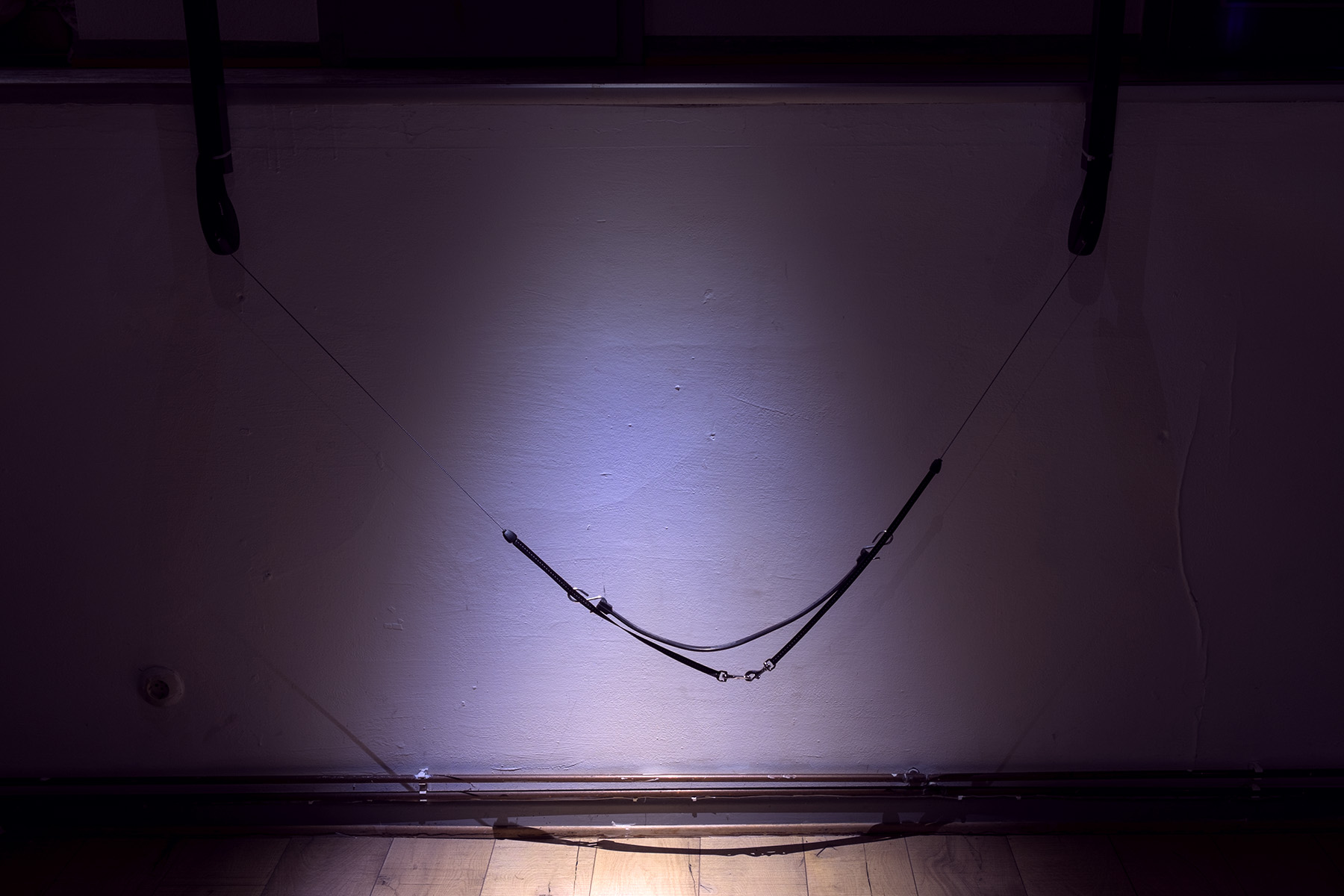 The performance begins with Hunter listening to the headset. Then Alice, holding the contact microphone to her throat, speaks with a dry raspy tone: “Operator prepare for earguard protection.” Whereupon Hunter slowly turns off the audio of Soft Core. Alice continues with the phrase, “operator proceed with earguard protection.” The contact microphone remains at her throat making her breathing audible, which accompanies the rest of the performance. Hunter puts the leash harness on and slowly passes through the lower room. He secures the harness on the opposite wall and thus fences on the headset. Subsequently, Hunter takes the solar cell from the Terminal and leads it into the laser beam where it meets the wall. The solar cell converts the light into an audio signal and creates a static noise which is repeated as Hunter moves the solar cell in and out of the laser beam, keeping rhythm with Alice’s breath. The performance ends with Hunter securing the solar cell on the wall, leaving the static noise to be permanently heard.