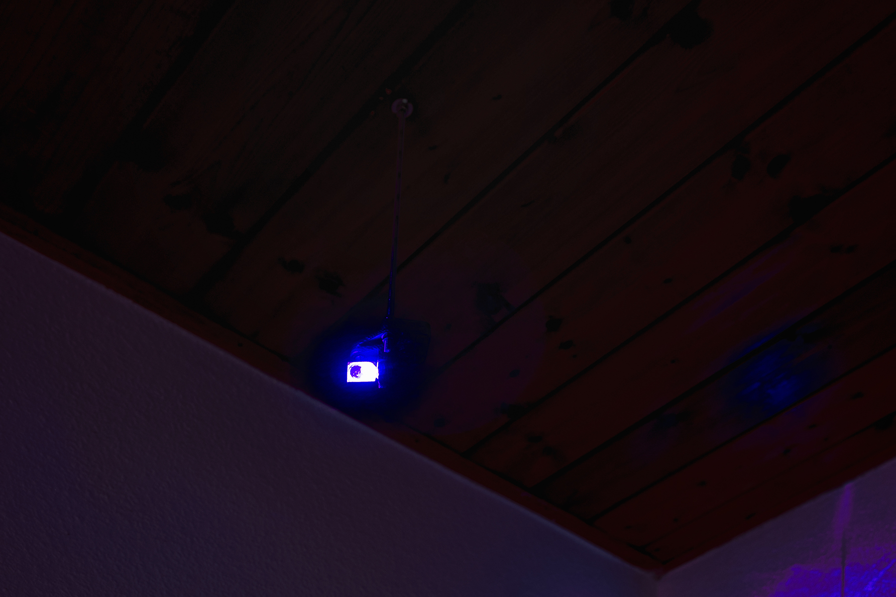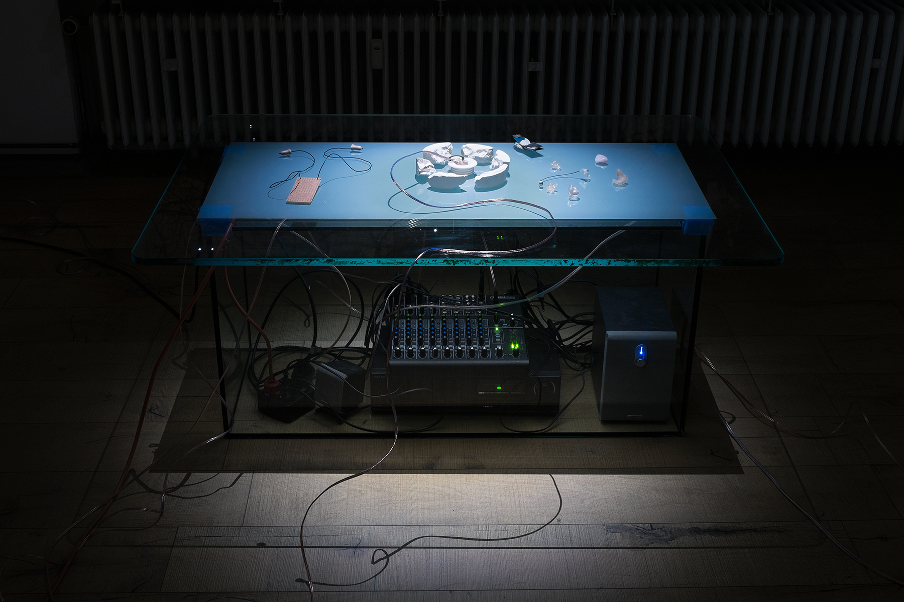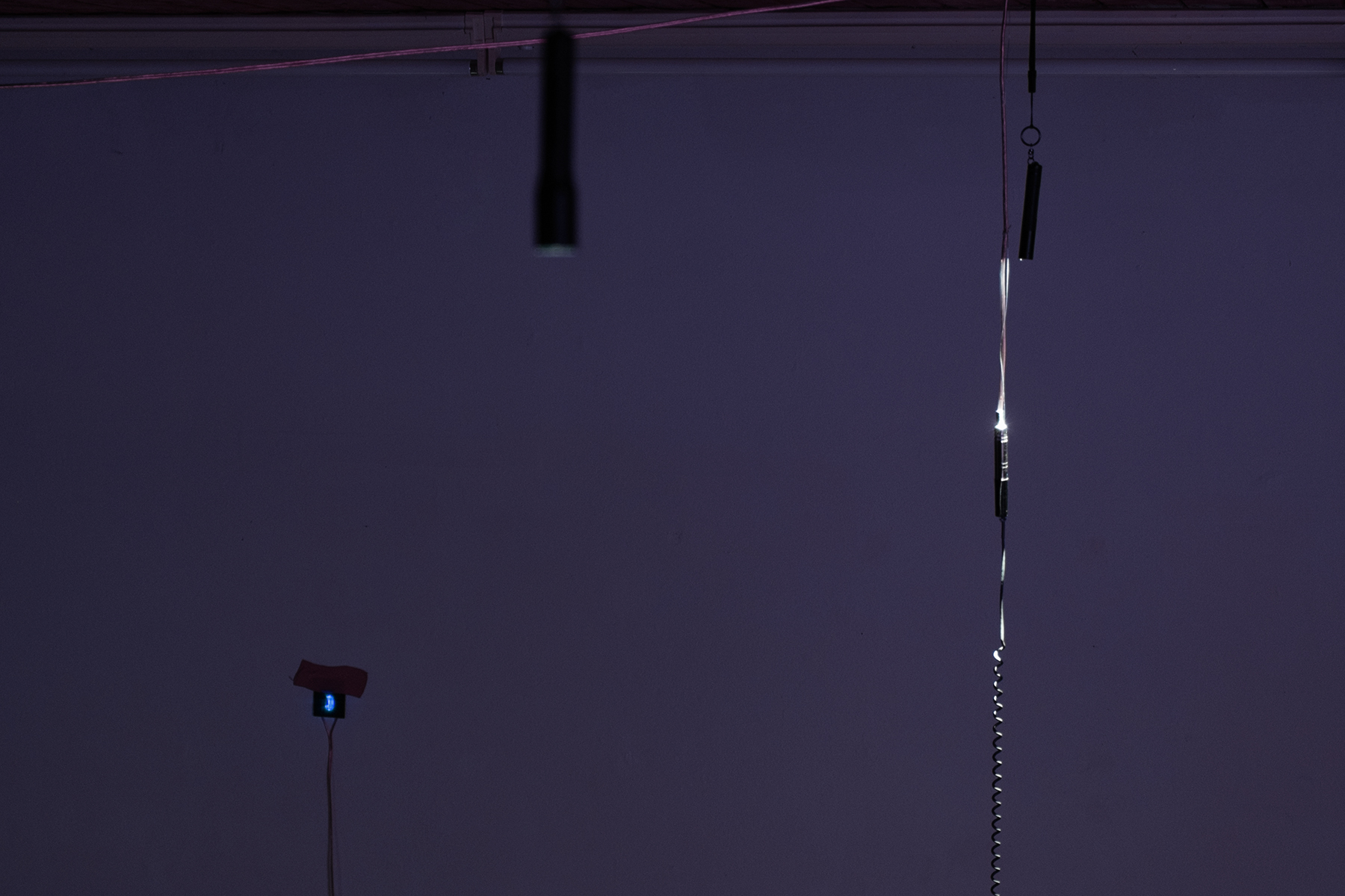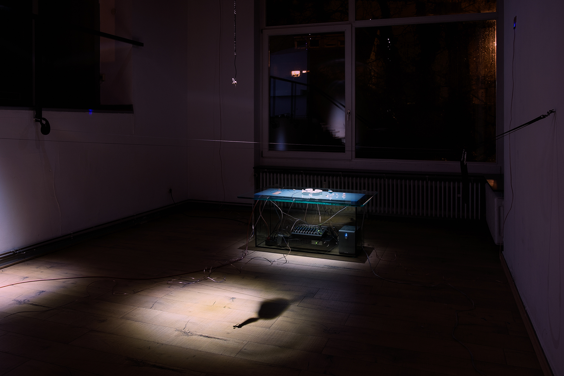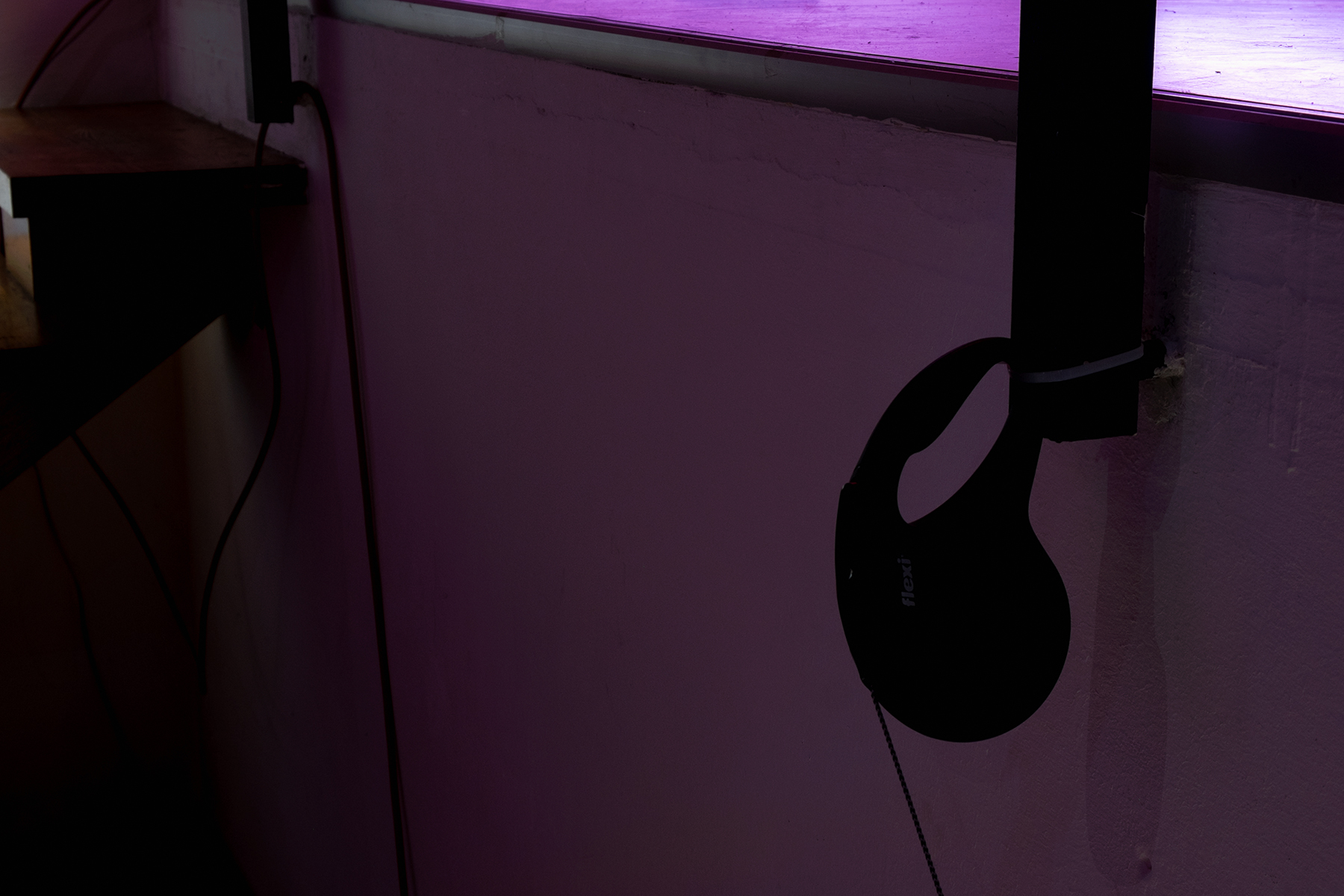 Vor dem Haus ist der Zutritt zu der Ausstellung Performing this Glitch gives you extra lives flankiert von einer Arbeit Hunter Longes. Sie besteht aus einer Plexiglasplatte, deren Perforation durch Beleuchtung sichtbar wird und ruht auf einer Gugelhupf Form. Der Innenraum des Hauses wird von hängenden Stabtaschenlampen und einem feinen violetten Laserstrahl schwach erleuchtet. Er verbindet den oberen mit dem unteren Raum, wo zwei Hundeleinen an einer Wand angebracht sind, deren Enden zu einem Geschirr verbunden sind. Flexileinen werden sie im Fachjargon genannt, denn sie rollen sich aus, wenn der Hund wegläuft und ein, wenn er zurückkommt. Etwa auf Augenhöhe hängt in der Mitte des Raumes ein Headset von der Decke. Nicht weit entfernt davon steht der Terminal, ein abgedecktes Aquarium, auf dem Boden. Darauf ausgebreitet liegen Abgüsse des Innenohrs, zusammen mit Materialkombinationen aus Leiterplatten und Oropax, sowie einem Kontaktmikrofon. Raffinierte Produkte fossiler Brennstoffe liegen neben Mineralien, in unterschiedlichen Verarbeitungsstadien – Glas, Gips, Plastik, Leiterplatten, Silizium – Relikte und Pseudorelikte. Das Aquarium ist das Zentrum der gesamten Rauminstallation. Aus ihm heraus mäandern die handgefertigten Kabel wie komplexe Wurzelsysteme durch den Raum. In ihm treffen sie sich, um in Lautsprechern, Verstärkern, Transformatoren und Stromquellen zu enden.
