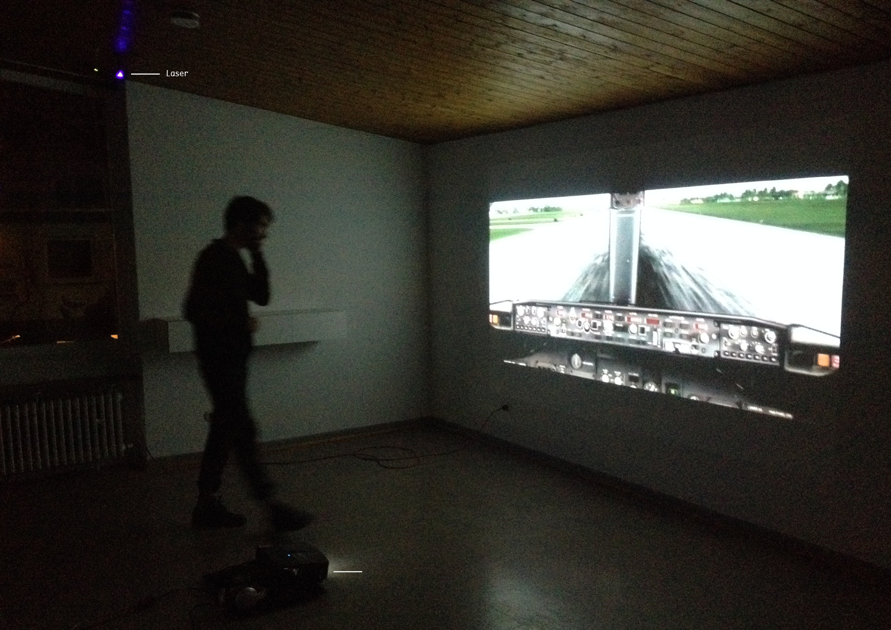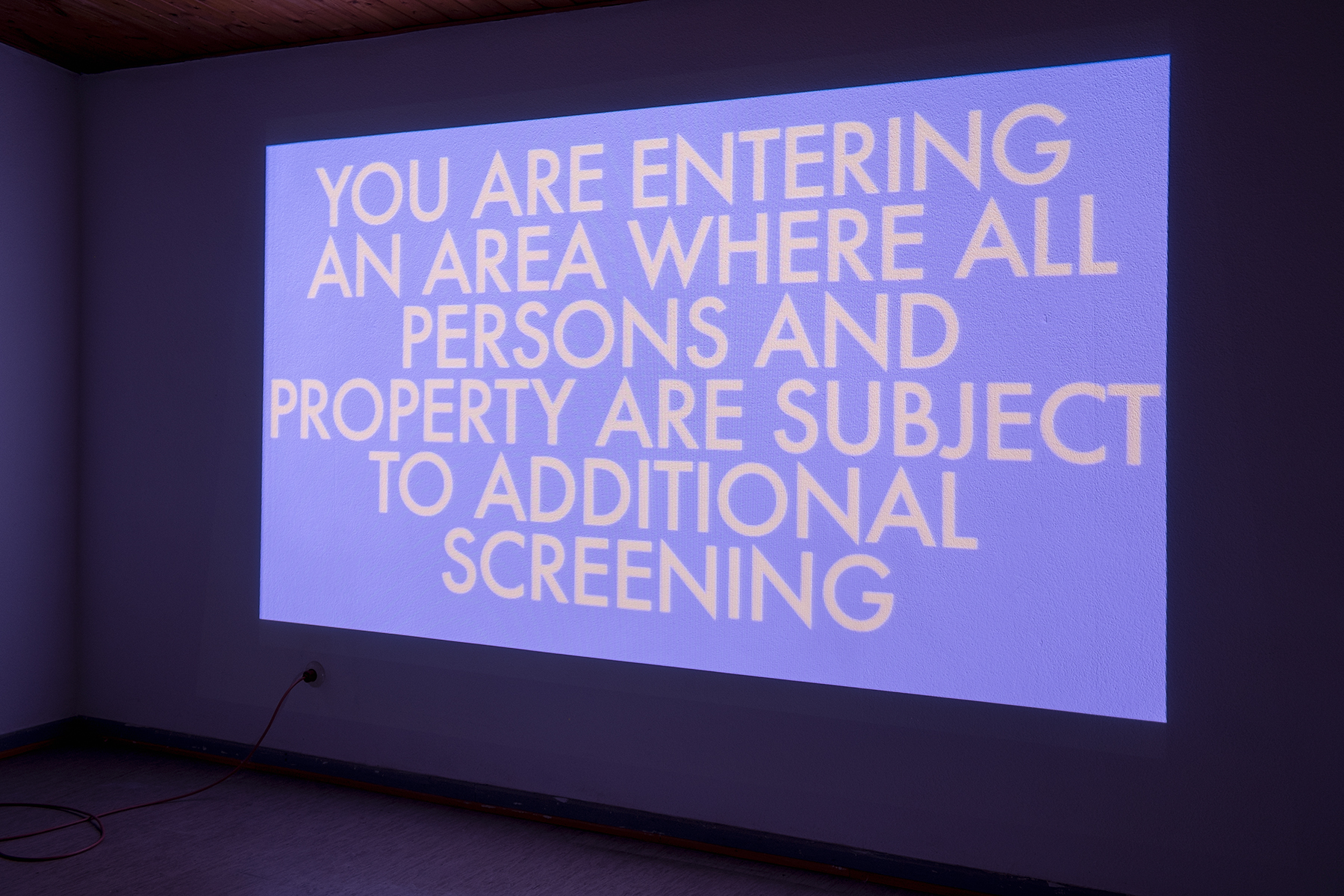 In the upper part of the house, Alice’s video Soft Sore is projected onto a wall. In short repetitive sequences, it shows the digital rendering of a house, a cockpit, a bullet sinking ever deeper into a kevlar vest, a woman’s face with a bizarre eyelash makeup mask and the text, “You are entering an area where all persons and property are subject to additional screening.”